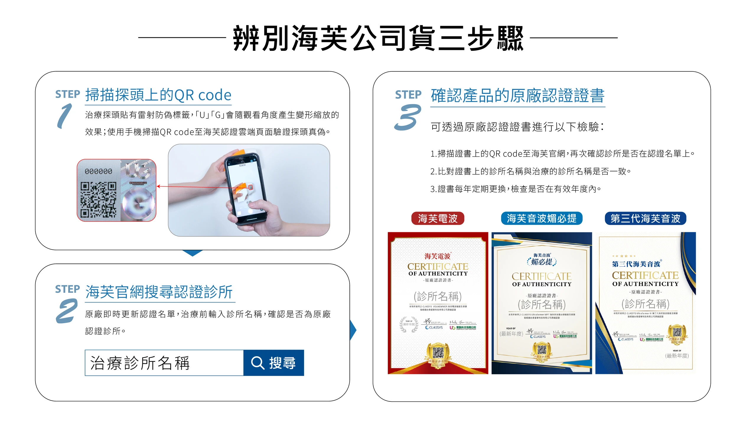 - 查詢認證診所清單: 至海芙原廠認證網站 查詢「認證診所」,唯有在官網名單內的診所,才能確保治療安全。